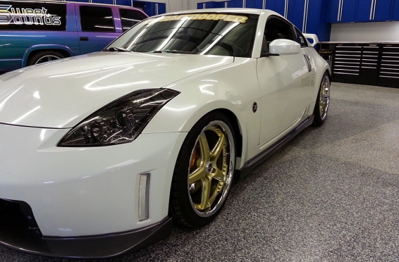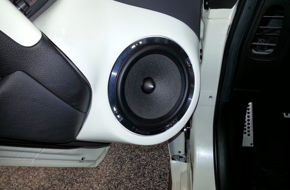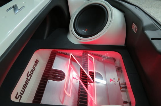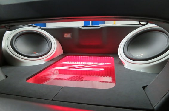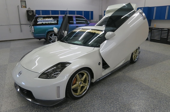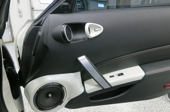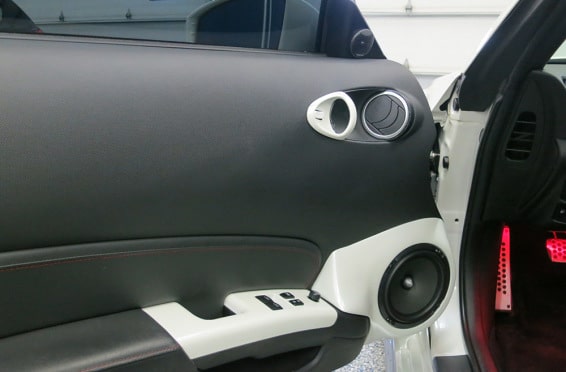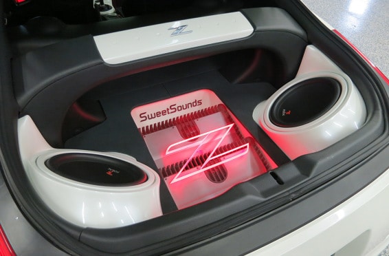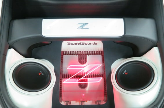 Notes: “Overall design we wanted to avoid filling the “tunnel” area in the hatch. Most 350z’s have that area either filled with subs or amps and we wanted to be able to view the entire audio system from either inside the front of the car or outside from the back. The design allows us to show off the whole system at one time which works great at car shows. The custom trim rings we made to replace the rubber gaskets for the woofers set it apart. They really add a unique and clean touch to the hatch area and are painted to match the rest of the system/vehicle. We then used this same technique on the rear speakers. It’s the little things that matter so much. The “Z” logo was both laser etched and then cut with a laser CNC. This allowed both the edges of the “Z” to glow along with the 3D effect of having the etching outline the “Z”. Very cool.”
