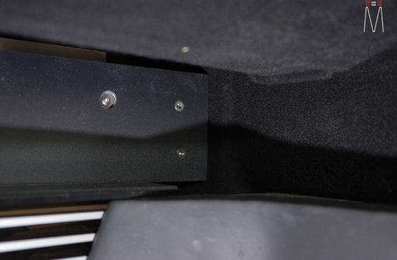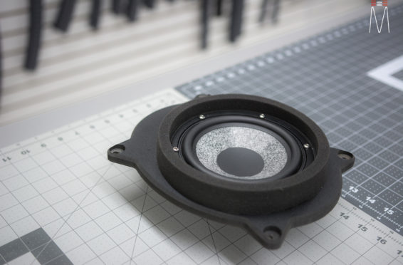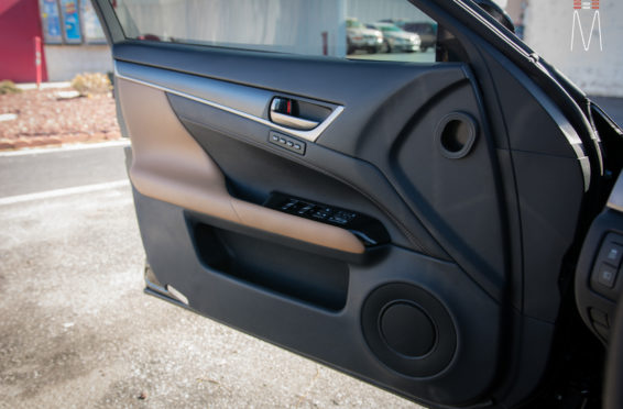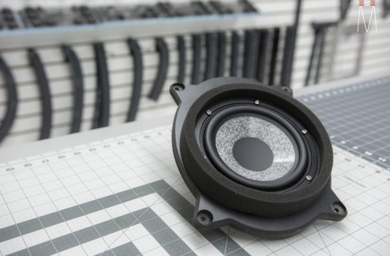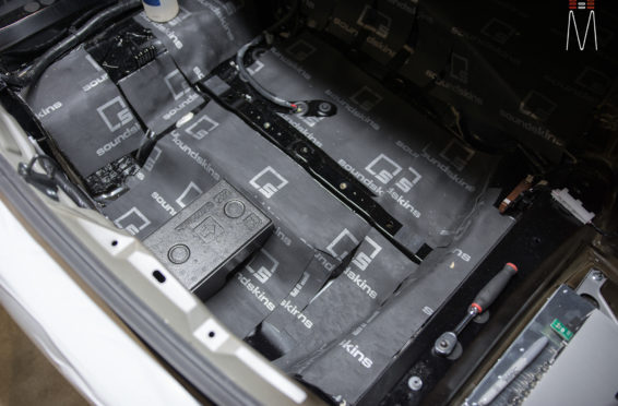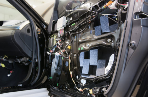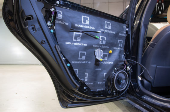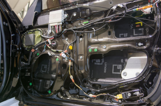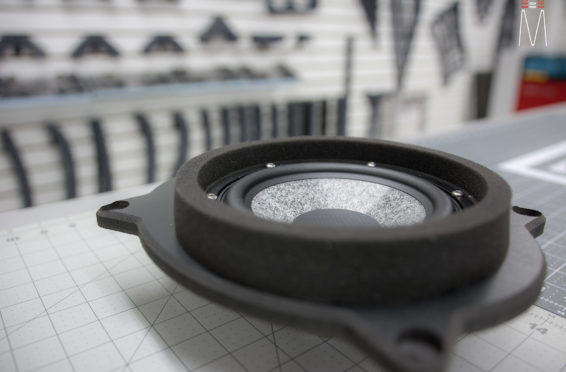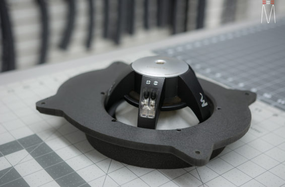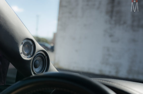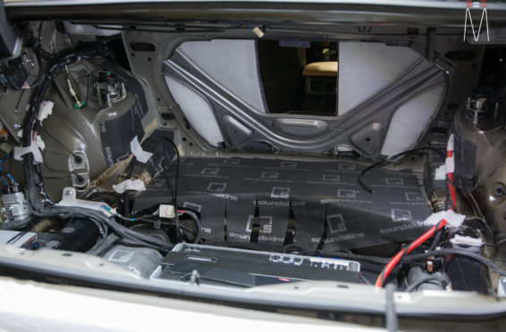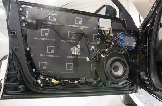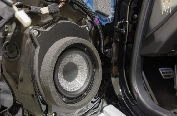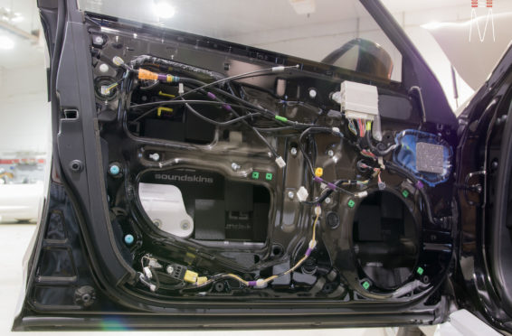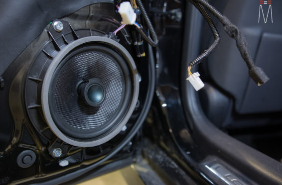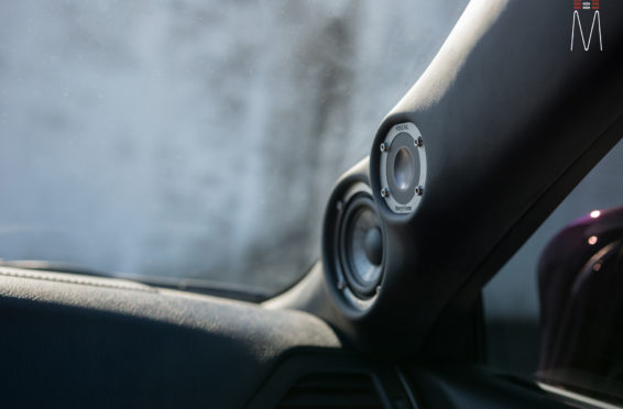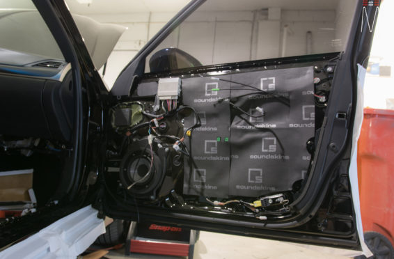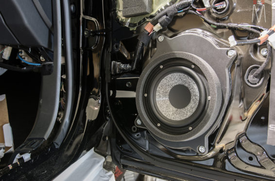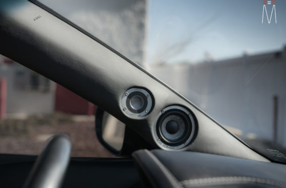 Starting with the front stage, we installed a set of Focal No. 7 – 3 Way Utopias. We modified and fabricated the a-pillars to house the mid and tweeter from the N0. 7 Kit. The pillars were wrapped in a matching leather. The mid bass woofer’s were installed in the Soundskins treated front doors. PVC speaker adapters were fabricated to mount the speaker to the factory bolt points. The inside door skins were also treated with Blackhole Tile. We chose the Focal IC165TOY speakers for a seamless plug and play drop in. The rear doors were also finished off these doors with Soundskins Lite treatment.