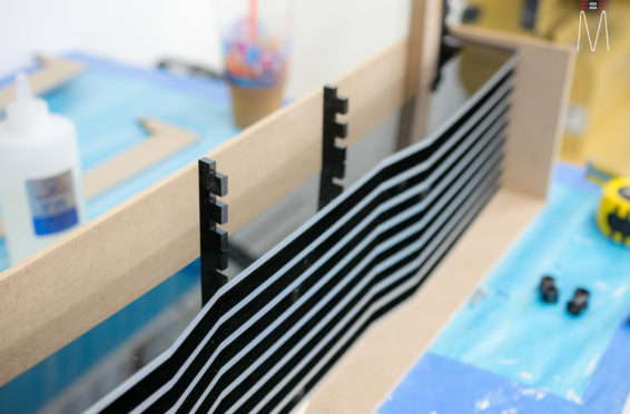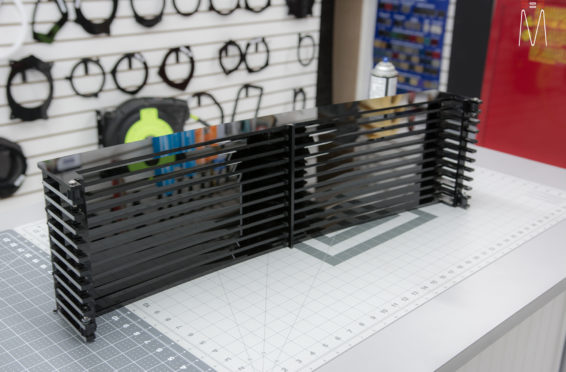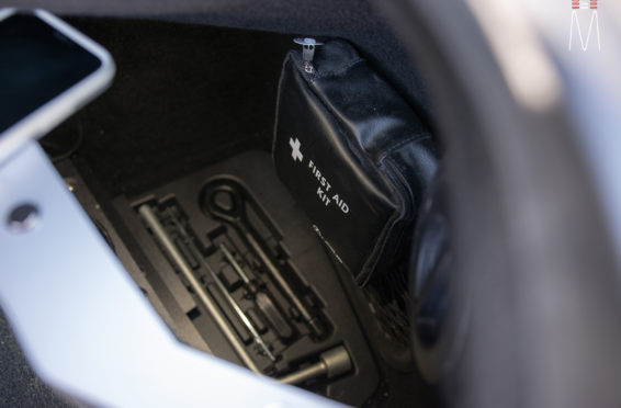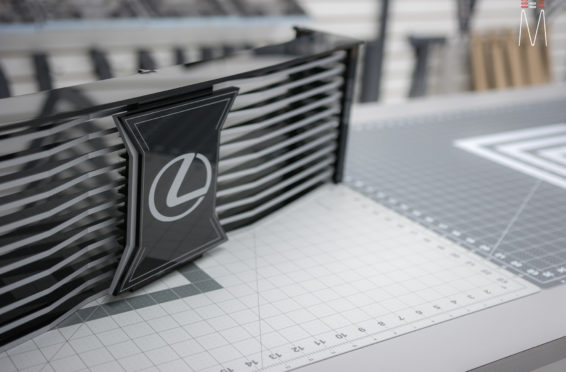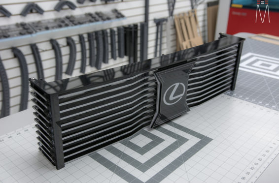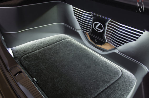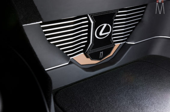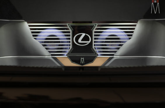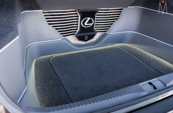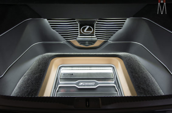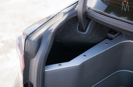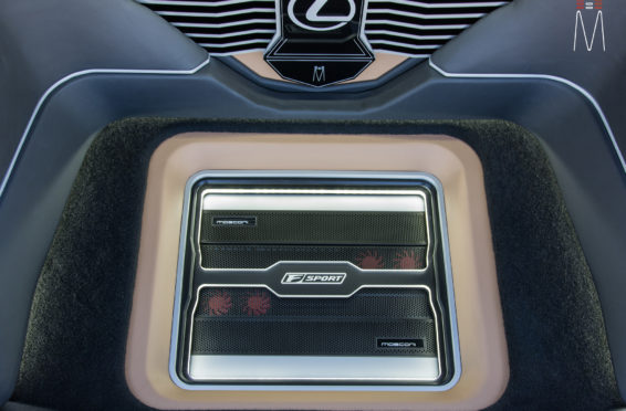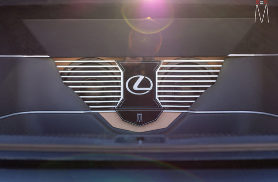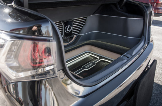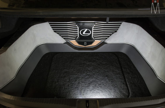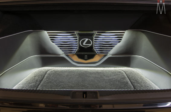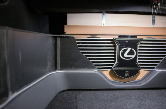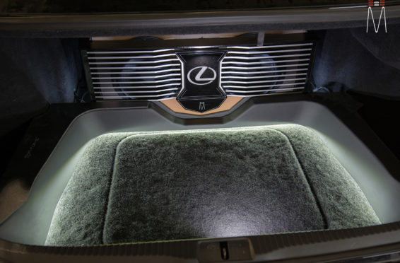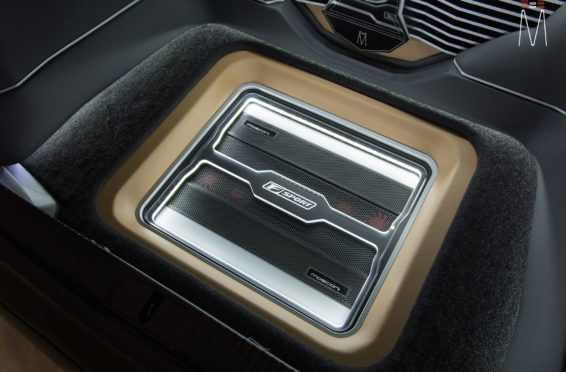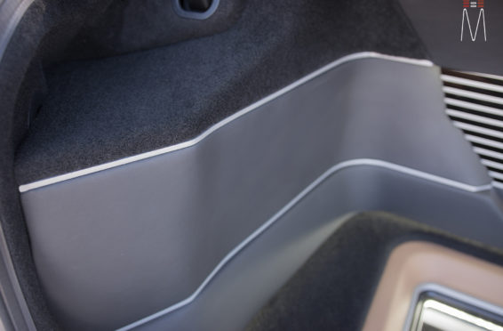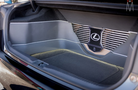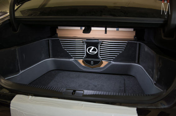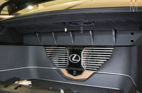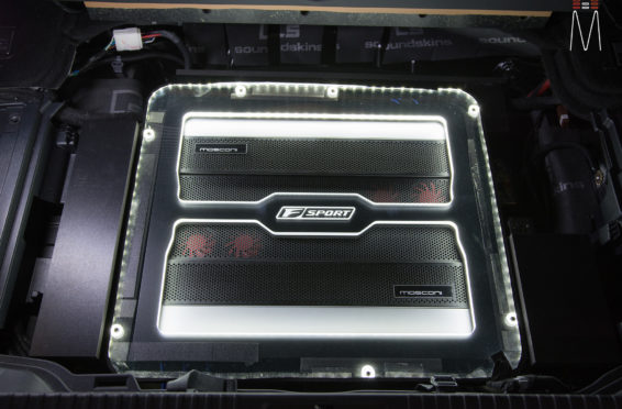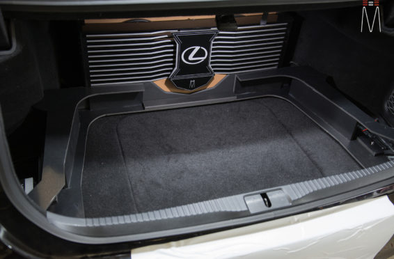 In the trunk of the vehicle we hand fabricated all of the panels to accent and subtly display our product. We wanted a clean and tasteful look that remained fully functional. A carpeted removable floor insert covers the sight of both Mosconi Pro 5/30 Amplifiers mounted under the lit acrylic amp rack. The two top carpeted inserts are fully removable via recessed locking magnets to gain access to the DSP, factory jack, lug tray, first aid kit and jack accessories. This opening also still allows quick and easy access for taillight replacement. A grille was made from acrylic and stacked to create the one of a kind highlight piece for the aesthetics of the trunk. The two Illusion Carbon 10XL Subwoofers sit lit up directly behind it. The trunk panels were wrapped in a matching leather. Finishing off the material selection was acrylic, carpet and matching tan vinyl.