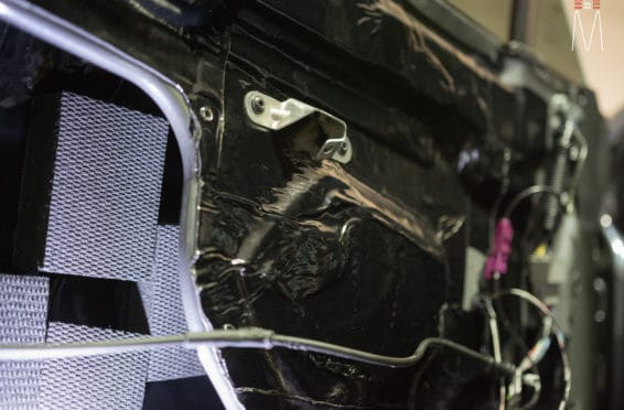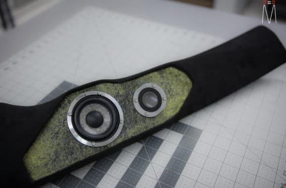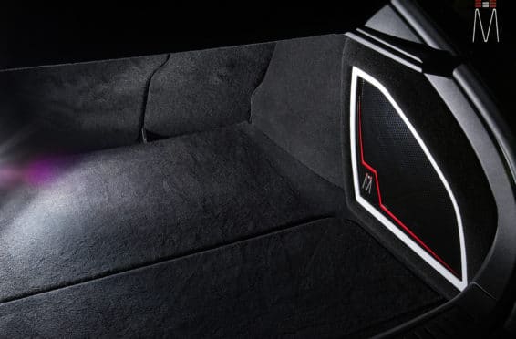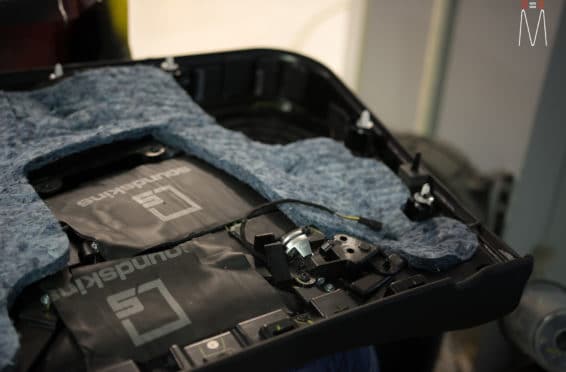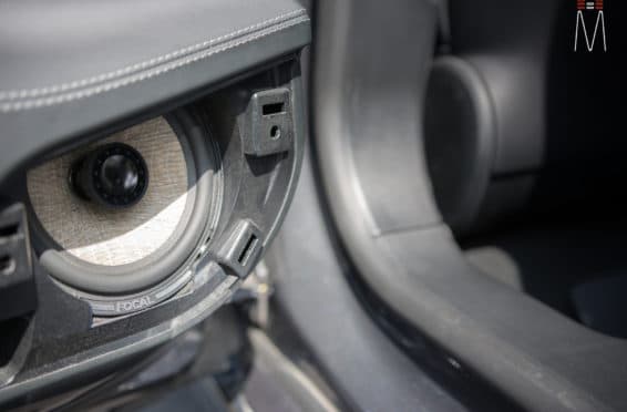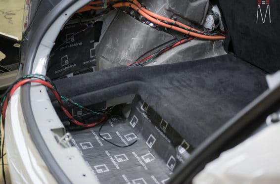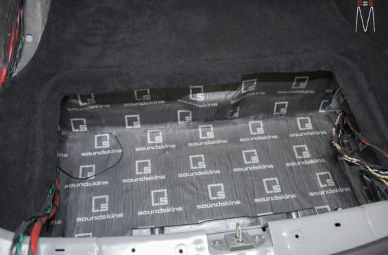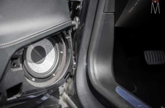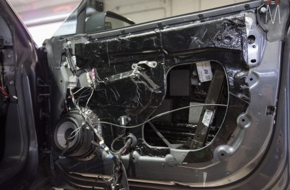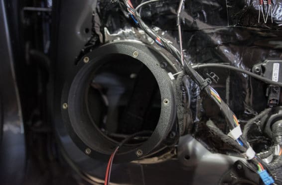 “We chose the ever popular Focal Utopia No.7 3 way speaker set for the front stage. We fabricated new a-pillars and made a custom grille to cover the equipment. The pillars we rewrapped in a matching Alcantara suede. The front doors were fully sound treated with a combination of Hushmat and Soundskins Pro. The outer door skin was finished off with Blackhole Tile. New speaker adapters were created by stacking multiple pieces of PVC together and matching the angle of the factory speaker with the Mobile Solutions Animal.