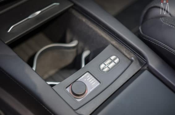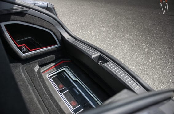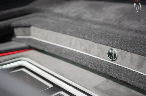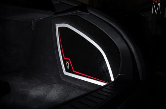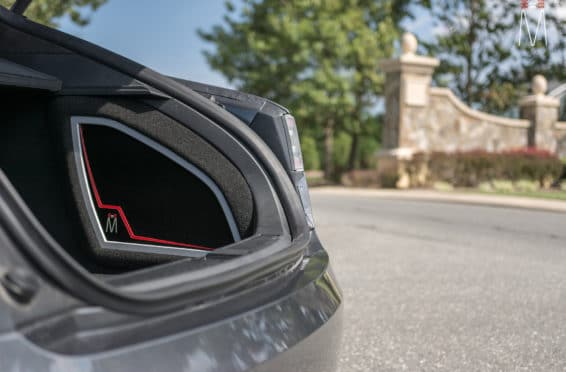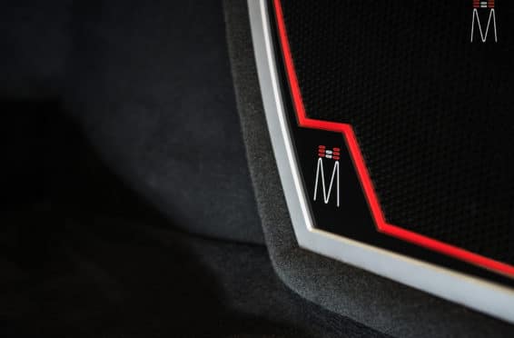 Focal Flax coax speakers were used in the rear and we followed suit with the sound treatment to match the front doors. The signal from the factory radio fed into a Mosconi 8to12 Aerospace DSP. This gave us the ability to mix in the factory radio to Preset 1 and use the AMAS BT chip to Preset 2. Preset 2 is driven by an Astell & Kern SP1000 Hi-Res player. A custom housing was fabricated to mount the mini RC Mosconi controller and Escort Max Ci 360 controller into the center console.