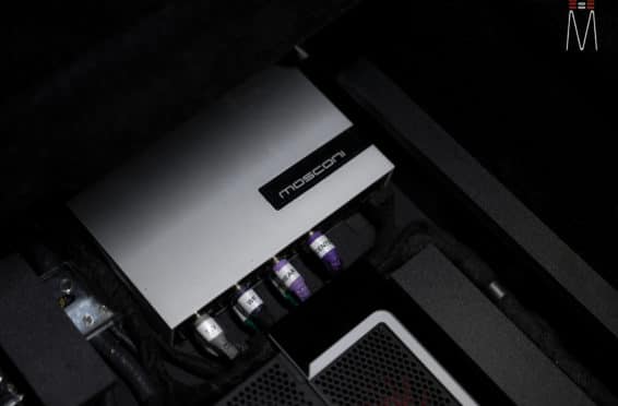 Mosconi Pro Amps were chosen for their great size to performance ratio. Two Class AB 4/10 (4 channel) amplifiers were chosen to run the Mid / Tweeter on one and the Woofer and rear on the other. We used a single 1/10 (mono) amplifier to run a single Raven XL 10″ Subwoofer.
