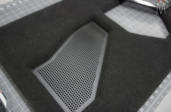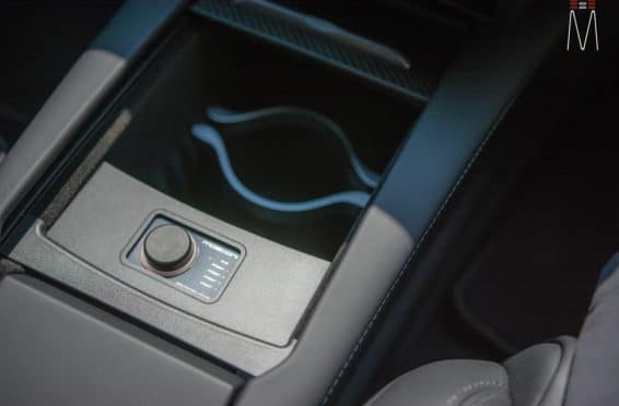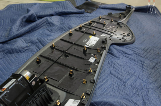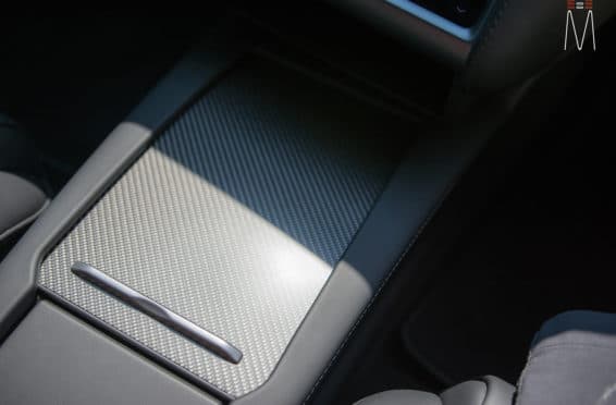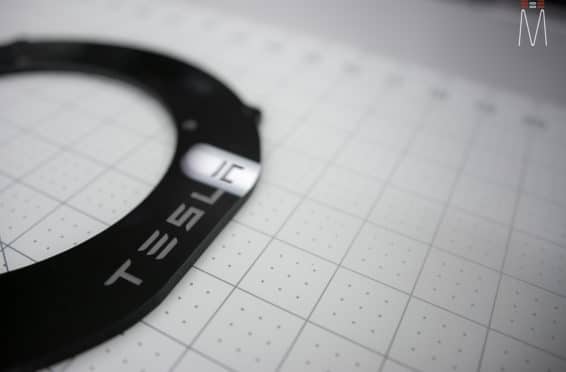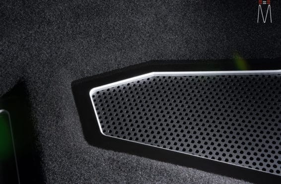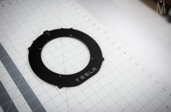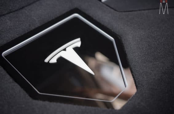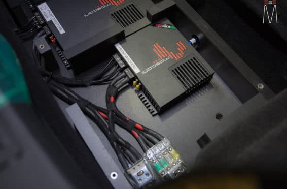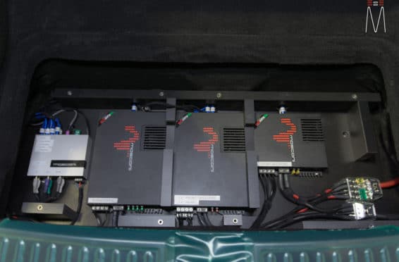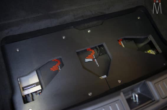 All signal runs through a Mosconi 6to8 Aerospace DSP. We tuned two different presets. One works with the factory Tesla system and the other with the AMAS BT Module. Our Mosconi controller is housed in an acrylic mount that sits under the retractable center console lid. A basic amp rack was made to cover the amplifiers. An acrylic Tesla “T” was made to be the focal point of the amp rack. Two acrylic grilles and trim flank the center to provide a vent for our equipment that hides beneath.”