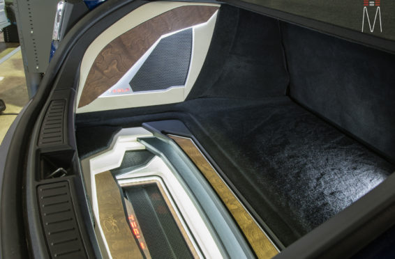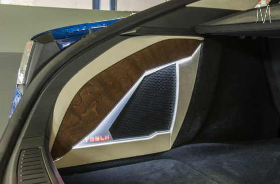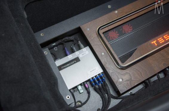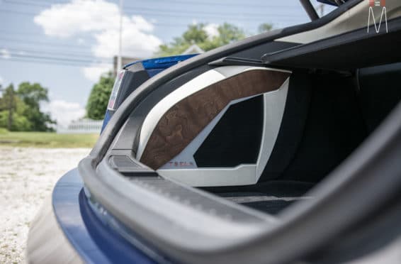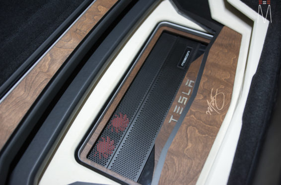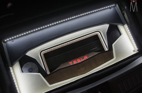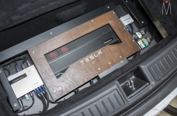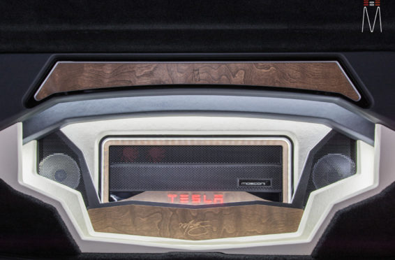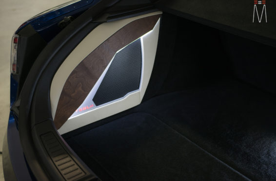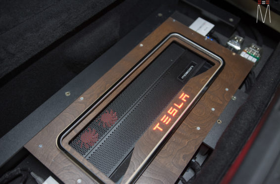 Hidden under the rear storage compartment resides our amplifier rack. Much like the subwoofer enclosure, we used matching materials to the inside of the vehicle. Multiple layers were created from the amplifier up to give a sense of depth. A matching Tesla logo was cut from acrylic and inserted into the wood finish to be the focal point of the amp rack. Two fans were mounted under the acrylic grille to circulate air through the amp rack. One of the fans is a push and one is a pull to maximize circulation. The OEM storage cover remains functional so you retain all of your trunk space. The full setup remains noninvasive to the vehicle and allows everything be returned to OEM without knowledge of anything ever being installed. ”