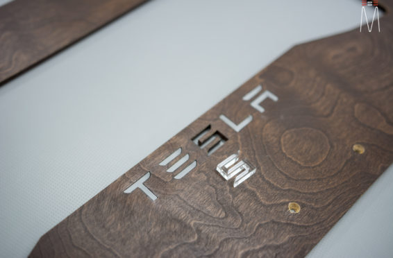 To house the subwoofer, a custom fiberglass enclosure was made. Inspiration from the vehicles interior were used to outfit the enclosure. We utilized matching stained wood, Alcantara suede, vinyl, silver trim, and matte black acrylic. We cut the Tesla logo from acrylic and flushed it into the silver trim for a focal point. Under the wood insert sits a lit layer of acrylic to accent the grille. The grille was cut from a single layer of acrylic.