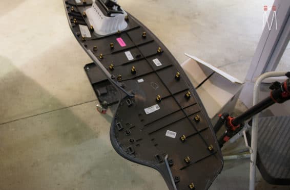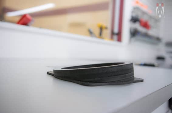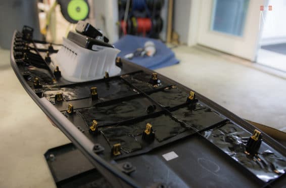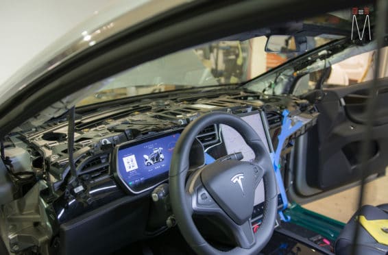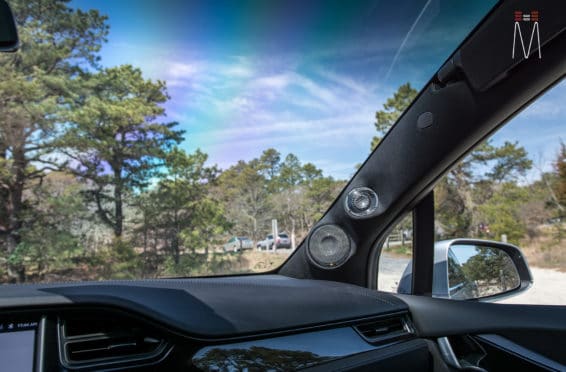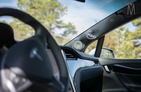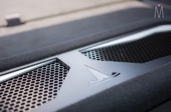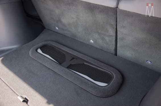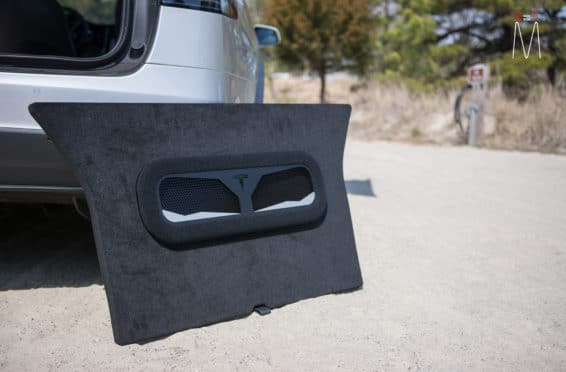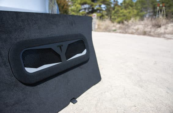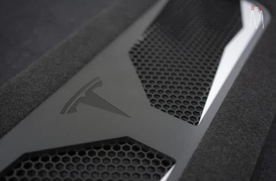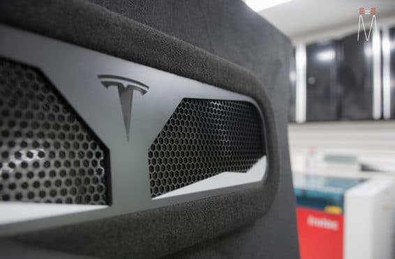 A PVC and acrylic trim was used to create a vent from the subwoofer and amplifiers from underneath. The design revolves around Tesla’s interior design and the shape of the Falcon wing doors. The enclosure that houses the Focal 10″ Utopia M subwoofer was built from Russian Baltic Birch. We then finished it with stain and epoxy followed by a few layers of clear coat. The enclosure was finished off with acrylic trim.
