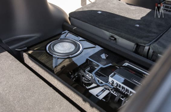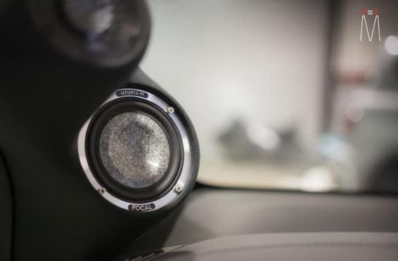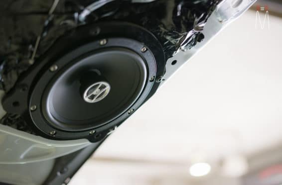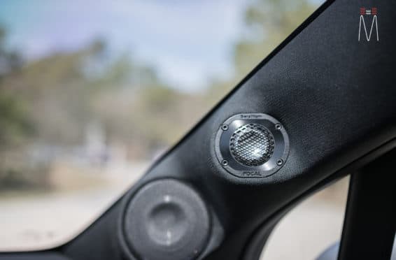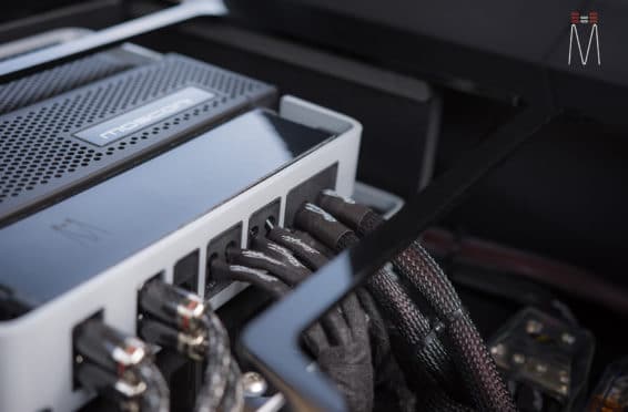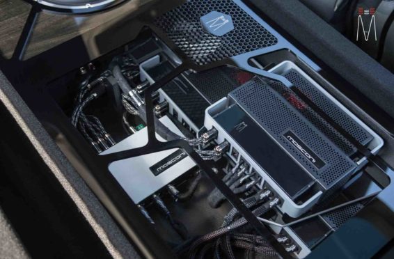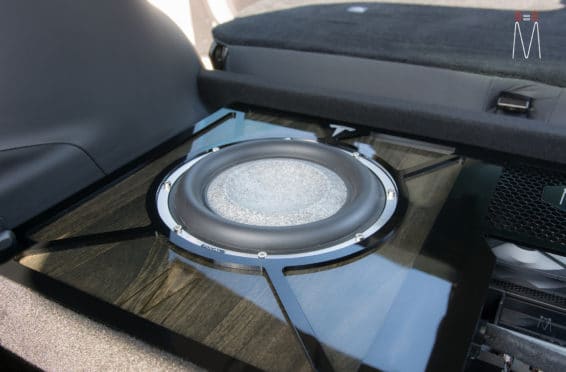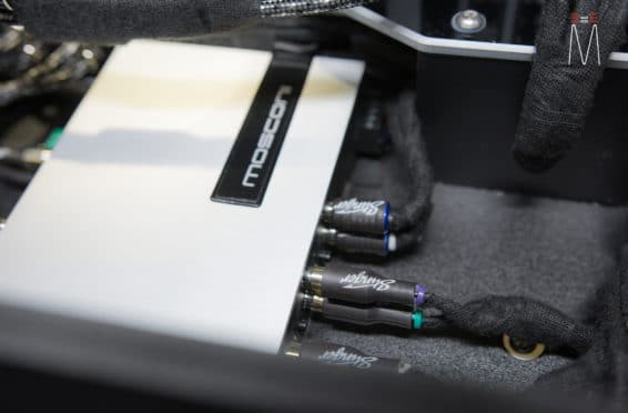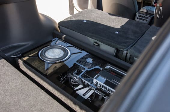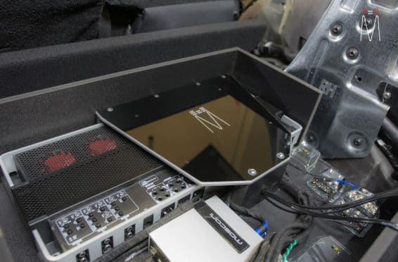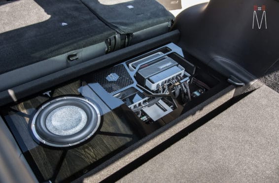 Mosconi Pro amplifiers was used as they have excellent sound quality while not having a big footprint. A Mosconi Pro 5/30 was used to power the rear speakers, front door mid bass woofers, and Focal Utopia M 10″ subwoofer. A Mosconi 4/10 was used to power our midrange and tweeters for our front stage. We created a design to conceal all of our equipment under the smaller storage area in the trunk. Under the OEM floor you can find all of our equipment finished off with an acrylic trim. All equipment is laid out in a way that is easily accessible and serviceable.