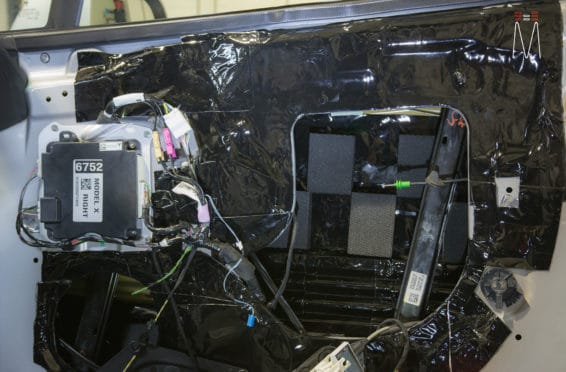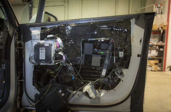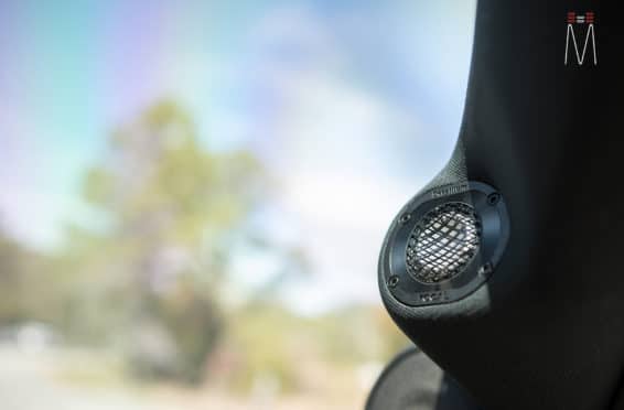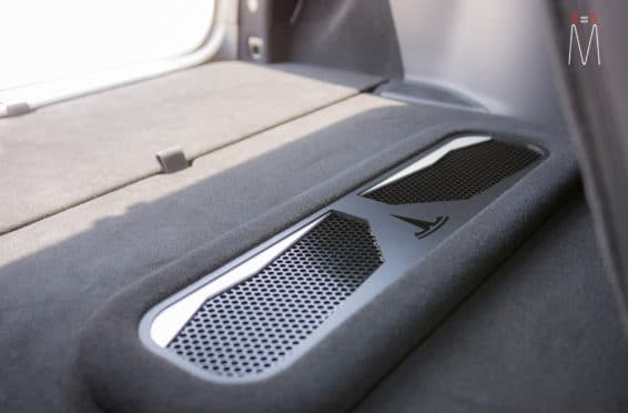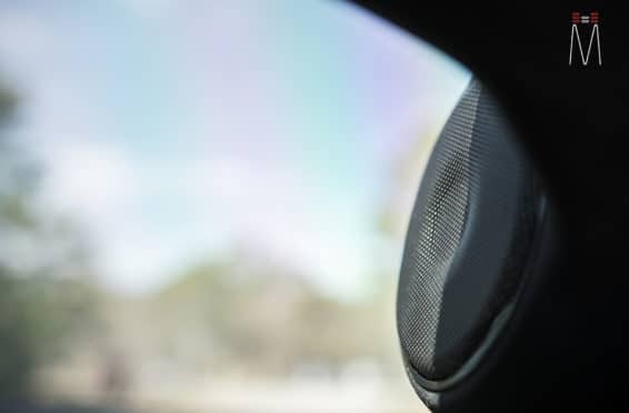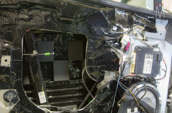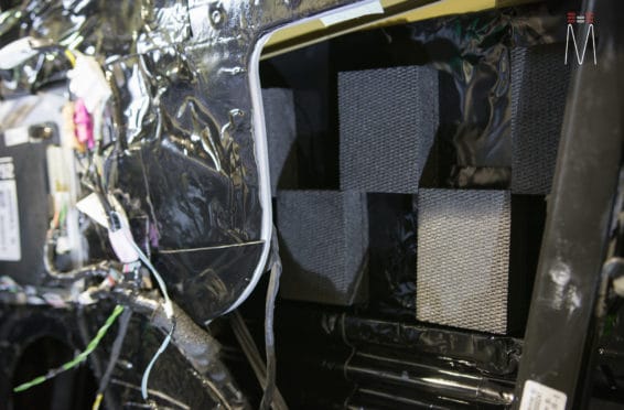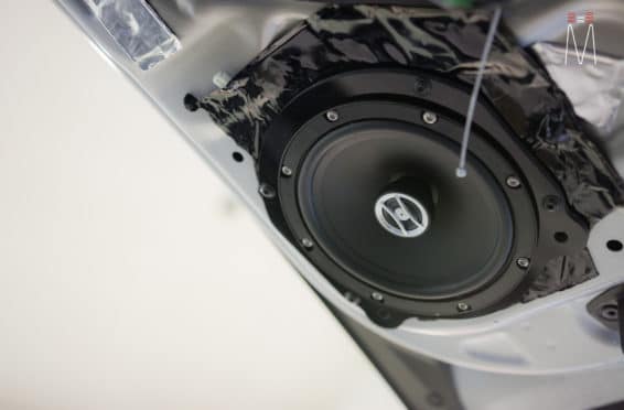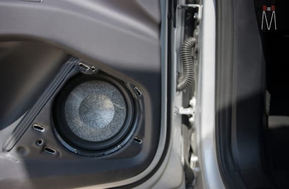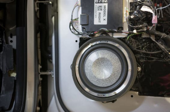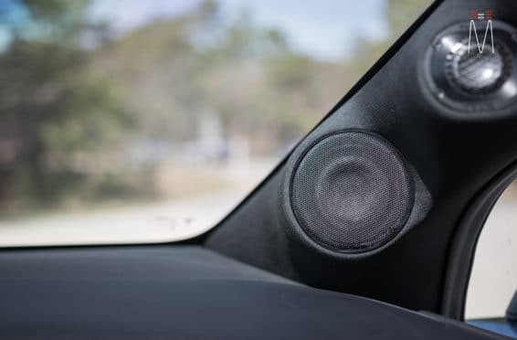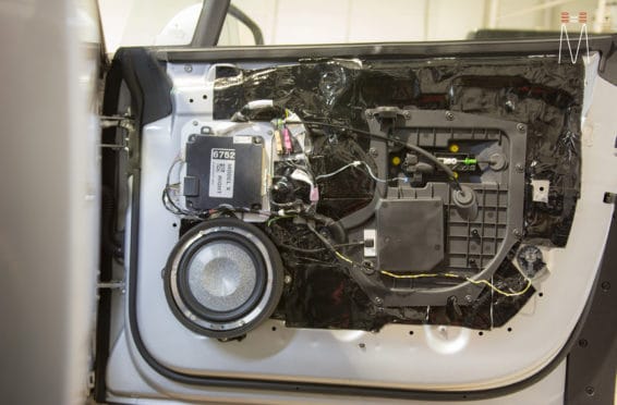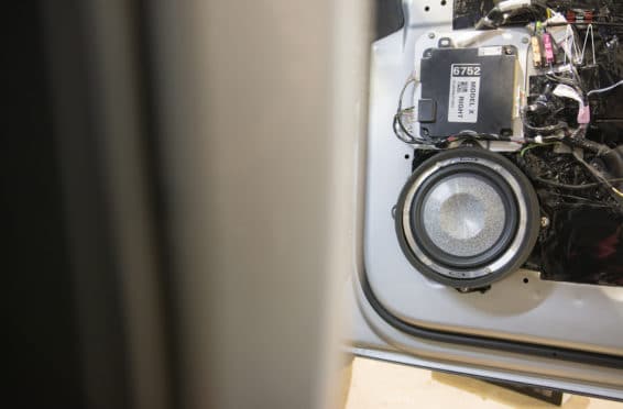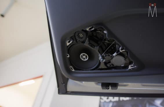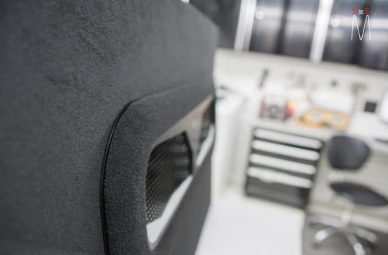For the front stage we utilized the newly released Focal Utopia 8″ midbass woofers, 3 -1/2″ midrange, and TBM tweeters. The front doors were fully sound treated with Hushmat and finished off with Blackhole Tiles. Custom speaker housings were fabricated to adapt our 8″ woofer into the factory location and set at the same angle. The OEM A-Pillars were modified to accept our midrange and tweeter on axis. A custom grille was fabricated and pressed to protect our midrange speaker. A concave press was used to compliment the tweeter grille and speaker cone design. A factory headliner material was sourced to refinish the pillar for an OEM finish. Focal Auditor was used as a simple replacement for the rear. New speaker adapters were fabricated in acrylic to bolt in like factory. A controlled amount Hushmat was used to sound treat the rear doors because of weight restraints.