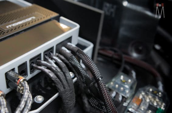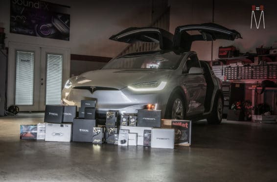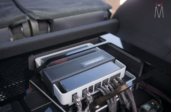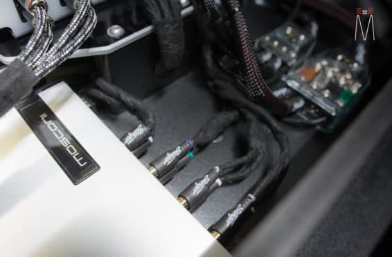 All of our signal ran through a Mosconi 8to12 Aerospace DSP. Our factory Tesla signal ran through preset 1. Preset number two features a tune for our AMAS96K BT streaming and Digital Coax input. Preset 3 gives us an analog input from our Astell & Kern Hi-Res DAP. The pocket under the MCU was modified to house our full size Mosconi Remote Control.