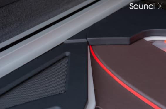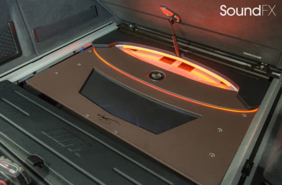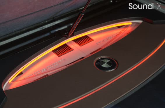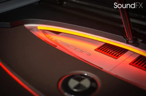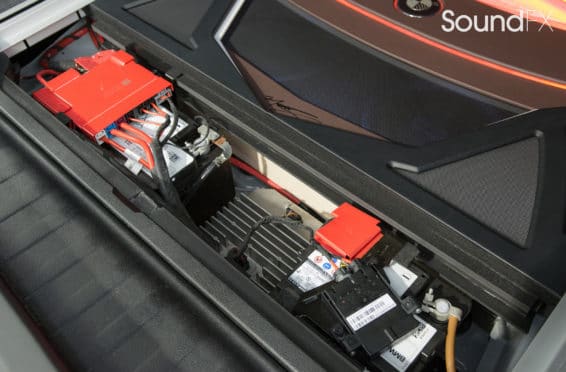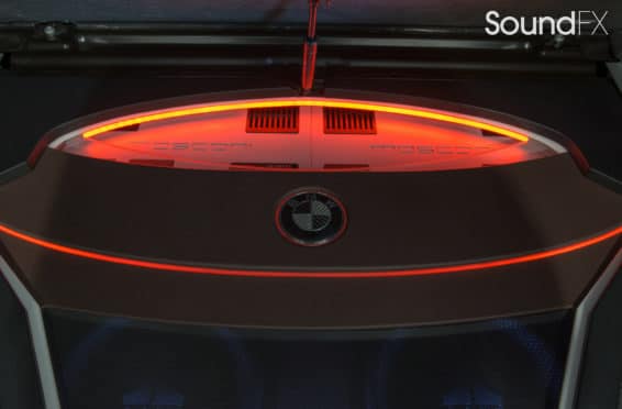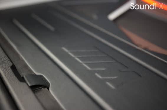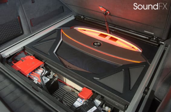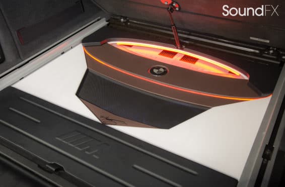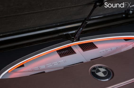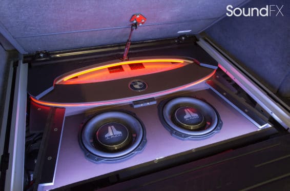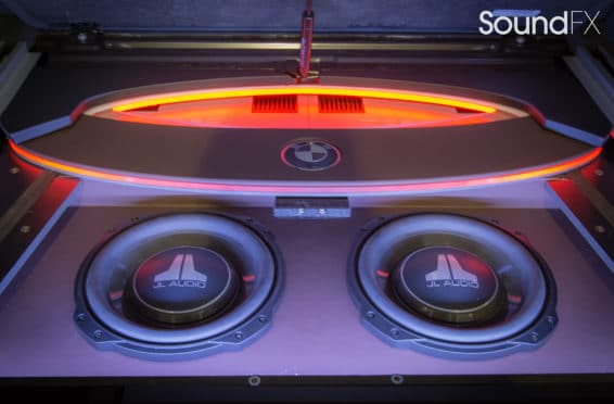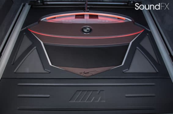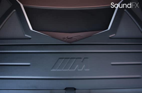 Under the rear floor we have our subwoofer enclosure housing two JL Audio 10TW3 Subwoofers. We have our four Mosconi Amplifiers (two hidden) trimmed out and lit up with a matching orange light under acrylic. We tracked down the factory materials to finish off the rear to wrap our accent panels in black and mocha brown. Somewhere on the installation, the client wanted me to “sign the artwork”, so I chose the spot in the bottom center where the trim comes together. A removable floor was made to access and service the OEM batteries. This panel was made with accent lines and finished off with the “M” logo. The orange lighting that we used was designed to match the OEM accents lights inside the car.”